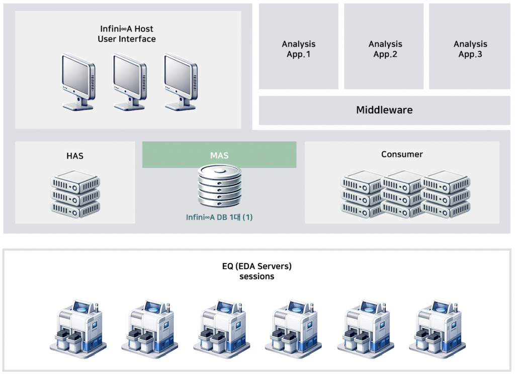 Infini-A is a family solution that fully implements the SEMI EDA Standard. It standardizes data generated from equipment and completes the data collection framework across the entire factory system as a comprehensive data service platform.